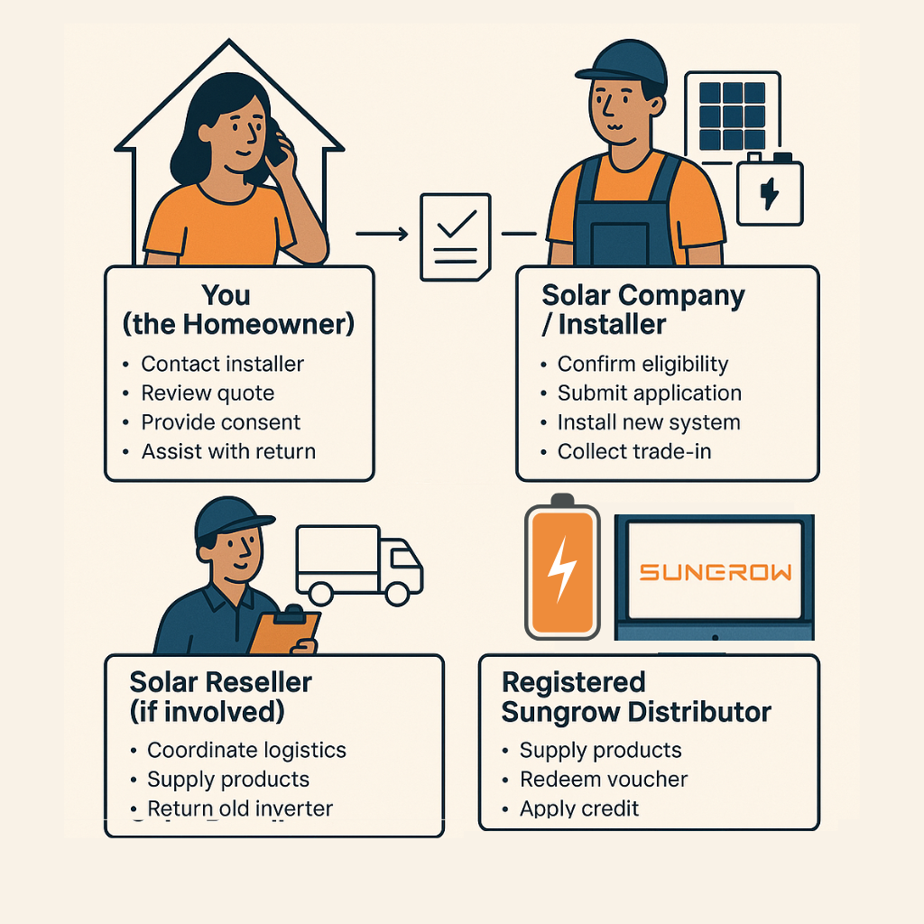 - You work through a Sungrow-accredited solar company, who manages the trade-in process on your behalf.
